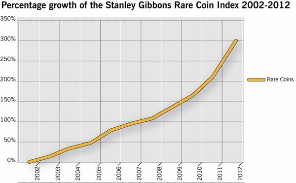 上記の図はスタンレーギボンズ社調査によるイギリスのレアコインインデックスを引用しています。